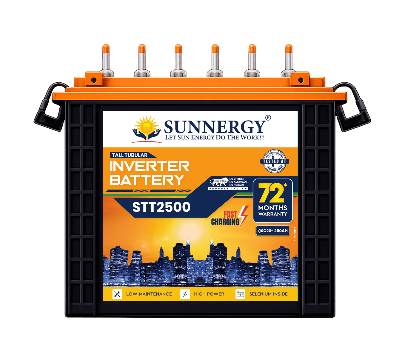 The STT2500 Inverter Battery is a premium, ultra high-capacity tubular inverter battery designed for very long backup duration, heavy-duty performance, and exceptional service life. With a massive 250Ah capacity and a 72 months warranty, this model is ideal for customers with high power consumption and locations facing long and frequent power outages. Manufactured using advanced tubular plate technology and a reinforced container design, the STT2500 delivers outstanding deep discharge performance, faster recharge, and stable output even under continuous heavy loads andhigh-temperature operating conditions.